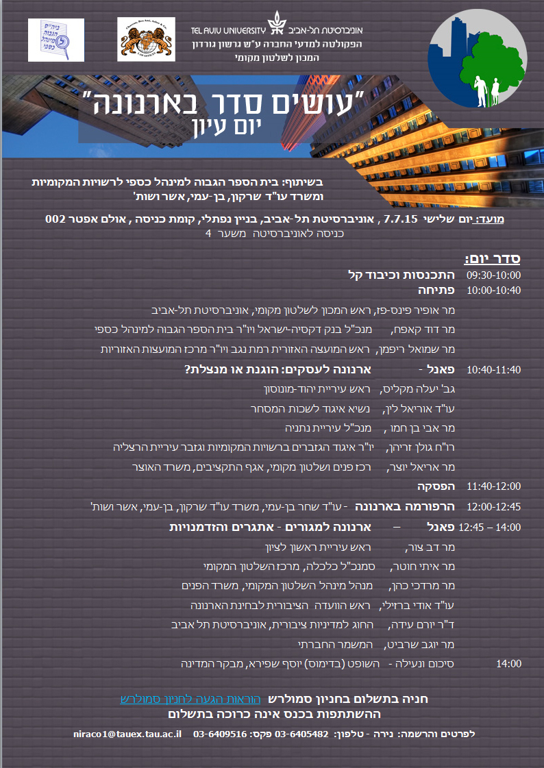 המכון לשלטון מקומי בחוג למדיניות ציבורית מזמין ליום עיון בנושא: ארנונה.
